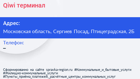 Qiwi, терминал по адресу Московская область, Сергиев Посад, Птицеградская, 2Б в дальнейшем Организация, размещена в следующих категориях: