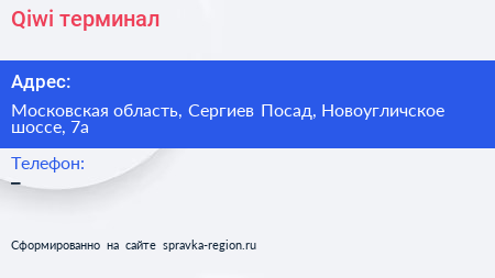Qiwi, терминал по адресу Московская область, Сергиев Посад, Новоугличское шоссе, 7а в дальнейшем Организация, размещена в следующих категориях: