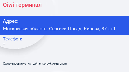 Qiwi, терминал по адресу Московская область, Сергиев Посад, Кирова, 87 ст1 в дальнейшем Организация, размещена в следующих категориях: