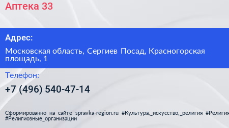 Аптека 33 по адресу Московская область, Сергиев Посад, Красногорская площадь, 1 в дальнейшем Организация, размещена в следующих категориях: