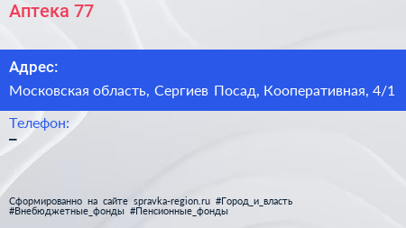 Аптека 77 по адресу Московская область, Сергиев Посад, Кооперативная, 4/1 в дальнейшем Организация, размещена в следующих категориях:
