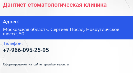 Дантист, стоматологическая клиника по адресу Московская область, Сергиев Посад, Новоугличское шоссе, 50 в дальнейшем Организация, размещена в следующих категориях: