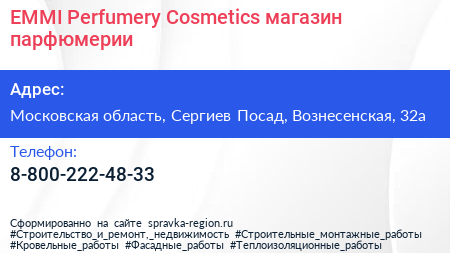 EMMI Perfumery & Cosmetics, магазин парфюмерии по адресу Московская область, Сергиев Посад, Вознесенская, 32а в дальнейшем Организация, размещена в следующих категориях:
