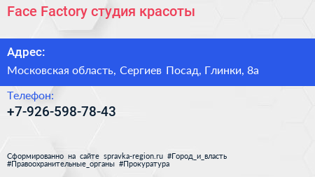 Face Factory, студия красоты по адресу Московская область, Сергиев Посад, Глинки, 8а в дальнейшем Организация, размещена в следующих категориях: