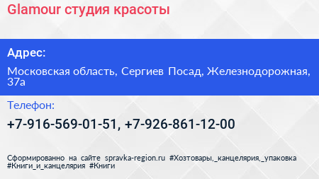 Glamour, студия красоты по адресу Московская область, Сергиев Посад, Железнодорожная, 37а в дальнейшем Организация, размещена в следующих категориях: