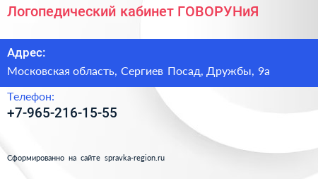 Логопедический кабинет "ГОВОРУНиЯ" по адресу Московская область, Сергиев Посад, Дружбы, 9а в дальнейшем Организация, размещена в следующих категориях: