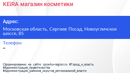 KEiRA, магазин косметики по адресу Московская область, Сергиев Посад, Новоугличское шоссе, 85 в дальнейшем Организация, размещена в следующих категориях: