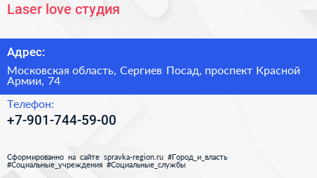 Laser love, студия по адресу Московская область, Сергиев Посад, проспект Красной Армии, 74 в дальнейшем Организация, размещена в следующих категориях: