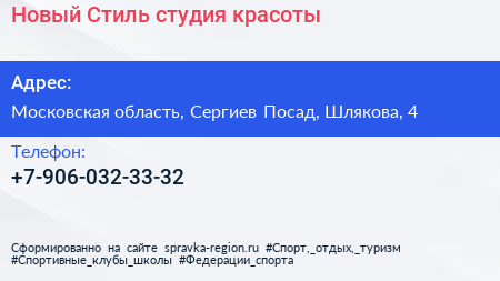 Новый Стиль, студия красоты по адресу Московская область, Сергиев Посад, Шлякова, 4 в дальнейшем Организация, размещена в следующих категориях: