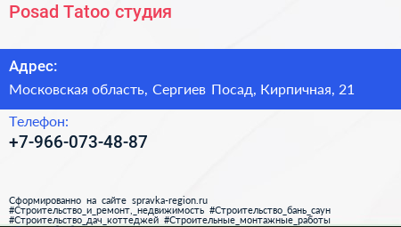 Posad Tatoo, студия по адресу Московская область, Сергиев Посад, Кирпичная, 21 в дальнейшем Организация, размещена в следующих категориях: