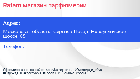 Rafam, магазин парфюмерии по адресу Московская область, Сергиев Посад, Новоугличское шоссе, 85 в дальнейшем Организация, размещена в следующих категориях: