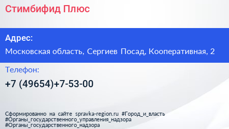 Стимбифид Плюс по адресу Московская область, Сергиев Посад, Кооперативная, 2 в дальнейшем Организация, размещена в следующих категориях: