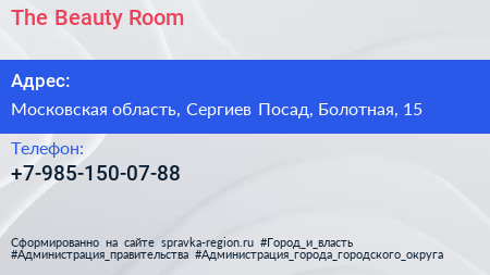 The Beauty Room по адресу Московская область, Сергиев Посад, Болотная, 15 в дальнейшем Организация, размещена в следующих категориях: