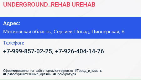 UNDERGROUND_REHAB UREHAB по адресу Московская область, Сергиев Посад, Пионерская, 6 в дальнейшем Организация, размещена в следующих категориях: