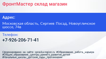 ФронтМастер, склад-магазин по адресу Московская область, Сергиев Посад, Новоугличское шоссе, 74в в дальнейшем Организация, размещена в следующих категориях: