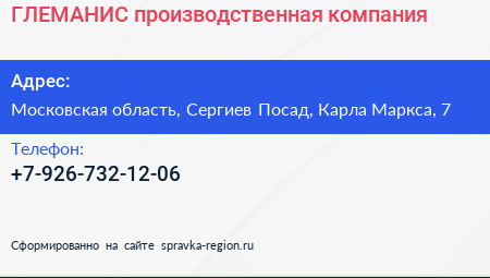 ГЛЕМАНИС, производственная компания по адресу Московская область, Сергиев Посад, Карла Маркса, 7 в дальнейшем Организация, размещена в следующих категориях: