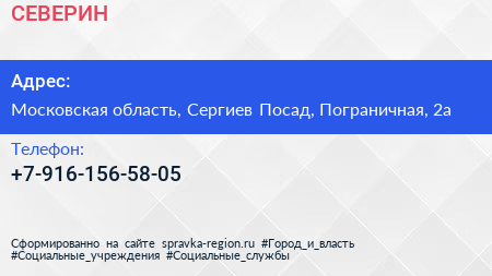 СЕВЕРИН по адресу Московская область, Сергиев Посад, Пограничная, 2а в дальнейшем Организация, размещена в следующих категориях: