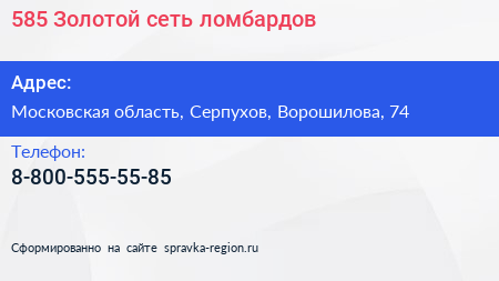 585*Золотой, сеть ломбардов по адресу Московская область, Серпухов, Ворошилова, 74 в дальнейшем Организация, размещена в следующих категориях: