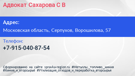 Адвокат Сахарова С.В. по адресу Московская область, Серпухов, Ворошилова, 57 в дальнейшем Организация, размещена в следующих категориях: