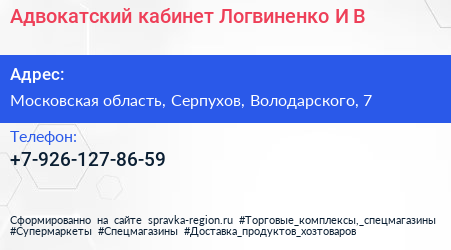 Адвокатский кабинет Логвиненко И.В. по адресу Московская область, Серпухов, Володарского, 7 в дальнейшем Организация, размещена в следующих категориях: