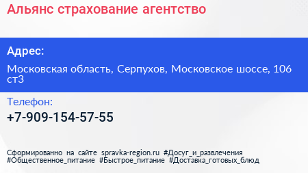 Альянс-страхование, агентство по адресу Московская область, Серпухов, Московское шоссе, 106 ст3 в дальнейшем Организация, размещена в следующих категориях: