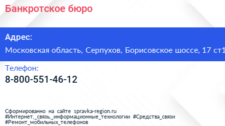 Банкротское бюро по адресу Московская область, Серпухов, Борисовское шоссе, 17 ст1 в дальнейшем Организация, размещена в следующих категориях: