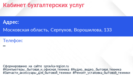 Кабинет бухгалтерских услуг по адресу Московская область, Серпухов, Ворошилова, 133 в дальнейшем Организация, размещена в следующих категориях: