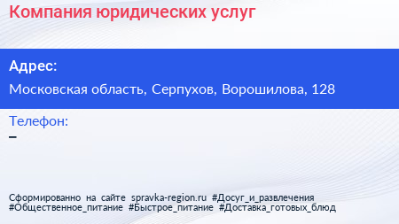 Компания юридических услуг по адресу Московская область, Серпухов, Ворошилова, 128 в дальнейшем Организация, размещена в следующих категориях: