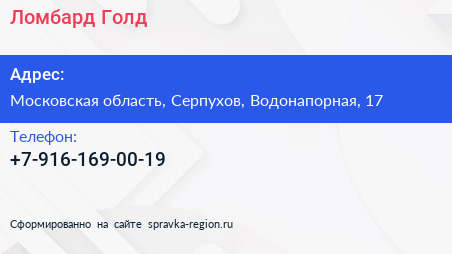 Ломбард Голд по адресу Московская область, Серпухов, Водонапорная, 17 в дальнейшем Организация, размещена в следующих категориях: