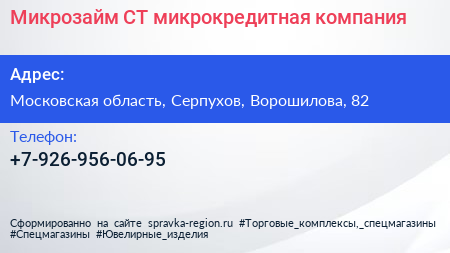 Микрозайм-СТ, микрокредитная компания по адресу Московская область, Серпухов, Ворошилова, 82 в дальнейшем Организация, размещена в следующих категориях: