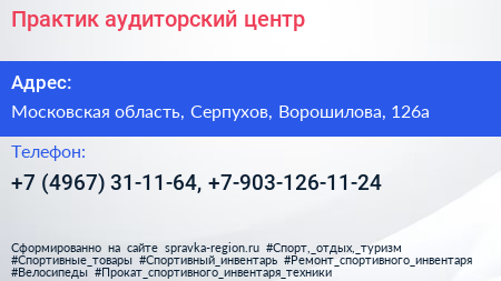 Практик, аудиторский центр по адресу Московская область, Серпухов, Ворошилова, 126а в дальнейшем Организация, размещена в следующих категориях: