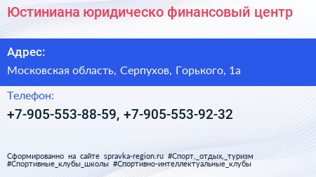 Юстиниана, юридическо-финансовый центр по адресу Московская область, Серпухов, Горького, 1а в дальнейшем Организация, размещена в следующих категориях: