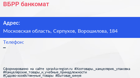 ВБРР, банкомат по адресу Московская область, Серпухов, Ворошилова, 184 в дальнейшем Организация, размещена в следующих категориях:
