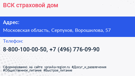 ВСК, страховой дом по адресу Московская область, Серпухов, Ворошилова, 57 в дальнейшем Организация, размещена в следующих категориях: