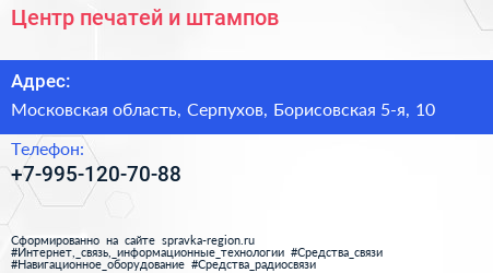 Центр печатей и штампов по адресу Московская область, Серпухов, Борисовская 5-я, 10 в дальнейшем Организация, размещена в следующих категориях: