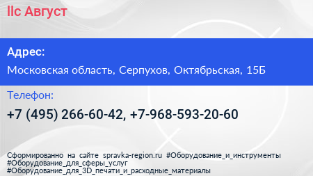 llc Август по адресу Московская область, Серпухов, Октябрьская, 15Б в дальнейшем Организация, размещена в следующих категориях: