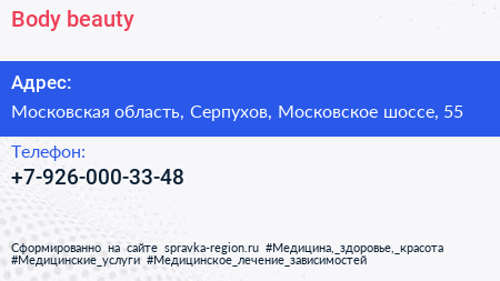 Body beauty по адресу Московская область, Серпухов, Московское шоссе, 55 в дальнейшем Организация, размещена в следующих категориях: