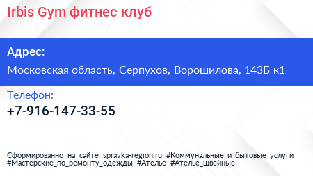 Irbis Gym, фитнес-клуб по адресу Московская область, Серпухов, Ворошилова, 143Б к1 в дальнейшем Организация, размещена в следующих категориях: