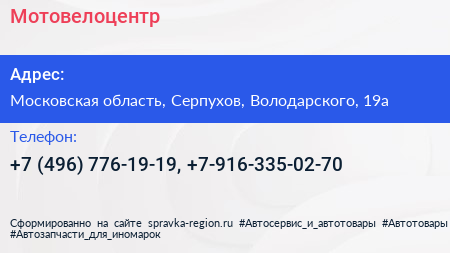 Мотовелоцентр по адресу Московская область, Серпухов, Володарского, 19а в дальнейшем Организация, размещена в следующих категориях: