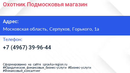 Охотник Подмосковья, магазин по адресу Московская область, Серпухов, Горького, 1а в дальнейшем Организация, размещена в следующих категориях: