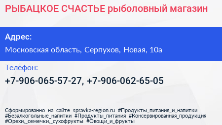 РЫБАЦКОЕ СЧАСТЬЕ, рыболовный магазин по адресу Московская область, Серпухов, Новая, 10а в дальнейшем Организация, размещена в следующих категориях: