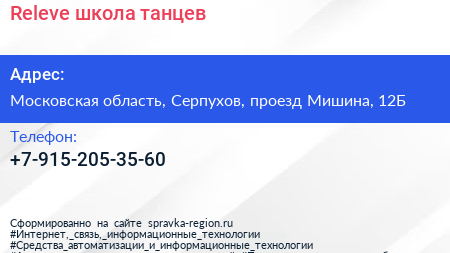 Releve, школа танцев по адресу Московская область, Серпухов, проезд Мишина, 12Б в дальнейшем Организация, размещена в следующих категориях: