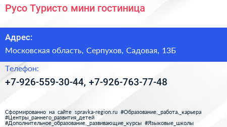 Русо Туристо, мини-гостиница по адресу Московская область, Серпухов, Садовая, 13Б в дальнейшем Организация, размещена в следующих категориях: