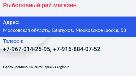 Рыболовный рай, магазин по адресу Московская область, Серпухов, Московское шоссе, 53 в дальнейшем Организация, размещена в следующих категориях:
