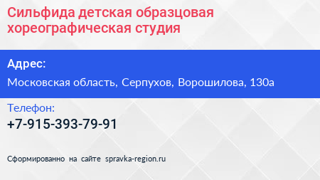 Сильфида, детская образцовая хореографическая студия по адресу Московская область, Серпухов, Ворошилова, 130а в дальнейшем Организация, размещена в следующих категориях: