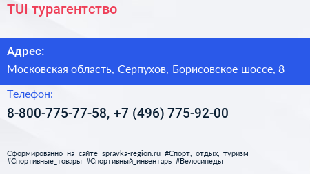 TUI, турагентство по адресу Московская область, Серпухов, Борисовское шоссе, 8 в дальнейшем Организация, размещена в следующих категориях: