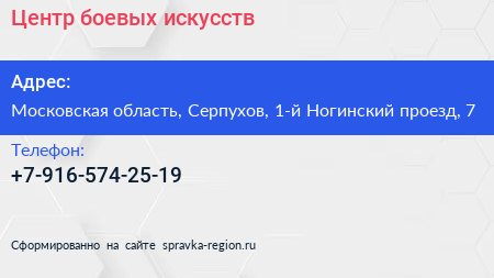 Центр боевых искусств по адресу Московская область, Серпухов, 1-й Ногинский проезд, 7 в дальнейшем Организация, размещена в следующих категориях: