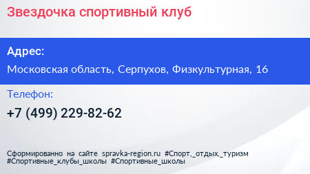 Звездочка, спортивный клуб по адресу Московская область, Серпухов, Физкультурная, 16 в дальнейшем Организация, размещена в следующих категориях: