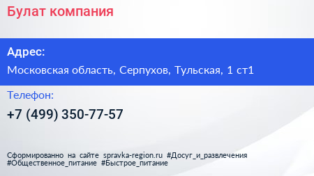 Булат, компания по адресу Московская область, Серпухов, Тульская, 1 ст1 в дальнейшем Организация, размещена в следующих категориях:
