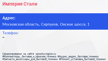 Империя Стали по адресу Московская область, Серпухов, Окское шоссе, 1 в дальнейшем Организация, размещена в следующих категориях: